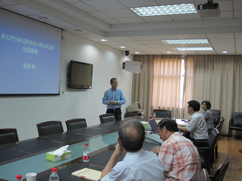 祝新华博士首先给大家做了题为“语文评估新近研究项与成果运用”的主题报告,他结合2005年以来承担的香港、新加坡等地政府委托的语文教学评估方面重大项目,给大家作了一场具有丰富学术前沿信息的学术汇报。祝新华博士首先对自己近年的研究领域作了一个总结,分别是:公开考试、促进学习的评估和基于评估结果设计的语文能力培养,并为大家介绍了近年他所主持研究项目的详细内容,这些项目包括香港中学会考研究、香港中学国文课程试卷编制、促进不同能力的提高方法等。在项目汇报过程中,祝新华博士着重向大家阐释了他对学生阅读能力所划分的六个等级:复述、解释、重整、伸展、评价、创意,并根据这六个标准和他的研究实例,为大家介绍和分析他的研究项目,随后祝新华博士对自己近年来的研究主题变化进行了一个梳理和总结,他的研究从语文测试转向促进学习的评估,从评估转向学生语文能力的培养,而在能力培养中,也经历了从阅读、作文、聆听、综合一直到口语交际的变化。最后他还特地向现场师生介绍了自己是如何将研究成果推广到教学实践中去,并与大家分享了六种途径:重视评估主题、举办培训课程、积极开展推进会、不间断重新开展研讨活动、参与社会服务和出版读物等。