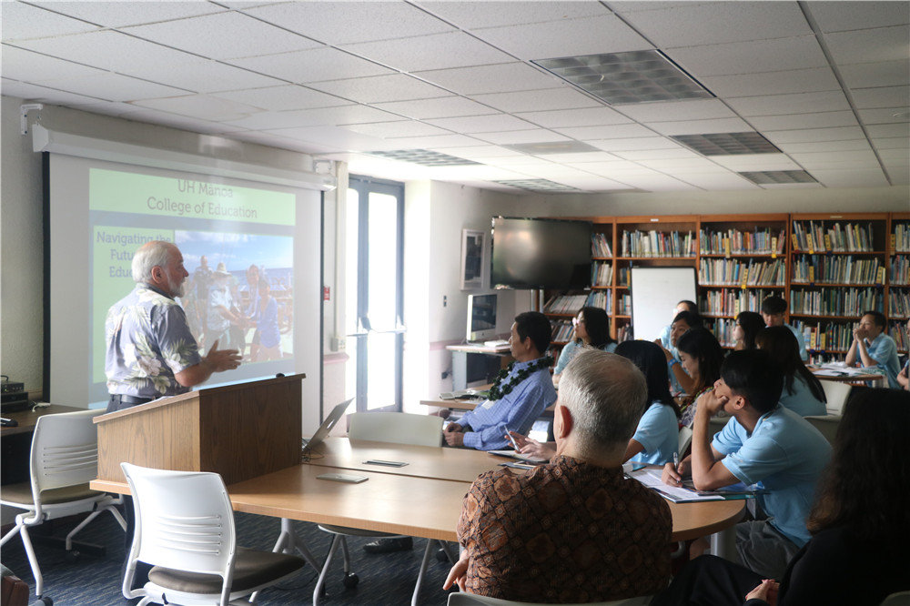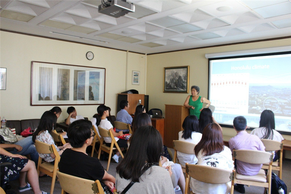 的办学定位、学科优势、人才培养、校园环境等方面给予了较详细的概述,同学们由此获得了夏威夷大学马诺阿分校丰富的学术信息。为促进同学们对夏威夷独特自然地理风貌的了解,地理专家Rowland博士声情并茂地介绍夏威夷火山的形成、地壳板块运动规律、火山与地震状况的监测等,促进同学们对夏威夷火山及自然风貌的科学认识。