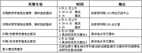 3、外院/校推免生复试工作根据生源报考情况,由研究生科在教育学、体育学各二级学科范围内依据报考专业组织若干复试组进行学科录取选拔复试。复试形式采用面试(含笔试)。