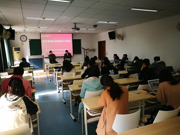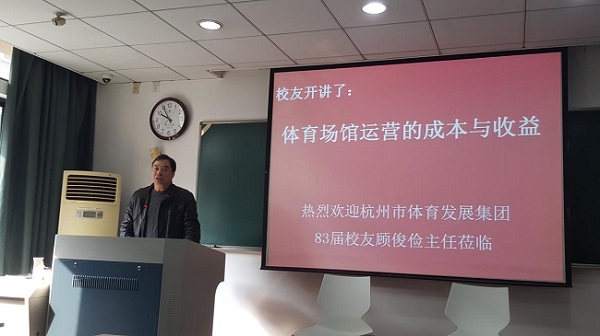 12月2日上午,杭州市体育发展集团管理委员会主任、原杭州大学83届校友顾俊俭应邀走进体育学系郑芳教授的《体育经济学》课堂,带来了一场题为“体育场馆运营的成本与收益”的讲座。
