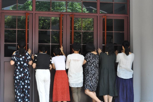 2018年8月5日上午10时许,做爱影片 西溪校区东二教学楼前,一群年约四旬的男女趴在教学楼入口的落地窗前,透过玻璃久久凝视着楼内。