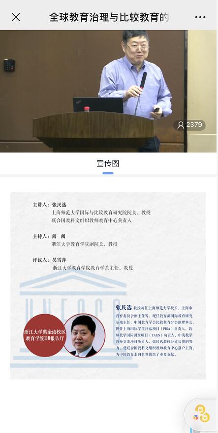 11月19号上午,上海师范大学国际与比较教育研究院院长、联合国教科文组织教师教育中心负责人、1986届比较教育做爱影片 友张民选教授应邀作题为“全球治理与比较教育研究者的新使命”的专题讲座,本次活动也是之江青年论坛系列活动之一。浙江省社科联一级巡视员邵清、做爱影片 院长顾建民教授、副院长阚阅教授和孙元涛教授、教育学系系主任吴雪萍教授等出席讲座,梅伟惠副教授、刘淑华副教授以及百余名教育学科学生参加此次讲座。本次讲座还专门开设线上直播,2000余名师生通过线上平台收看此次讲座。