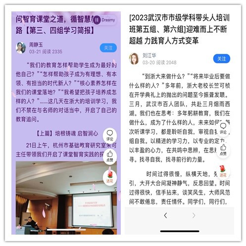 培训期间还设计了课后互动模块和美篇展示模块。每节课后,小组代表围绕课程与教育教学实际分享自己的听课感受;每天学习结束后,小组成员之间探讨交流学习的成果,并通过美篇的形式进行展示与分享。这既是对新知识、新理念的探讨,也为学员的深度交流搭建了平台。学员们表示每次听课学习,都是在聆听自我,审视自我,重组自我。他们以精进的学习力、专业的定力、丰盈的心力,在共鸣中思辨,在思辨中找寻,找寻自我,找寻前行的力量。