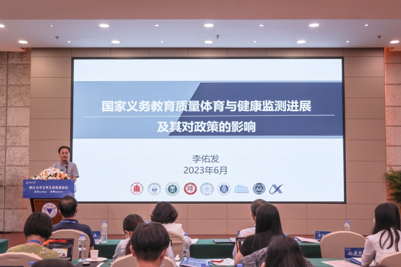 北京师范大学教授、国家义务教育质量监测“体育与健康”组组长李佑发报告了《国家义务教育质量体育与健康监测进展及其对政策的影响》。他介绍了国家教育质量监测的主要做法、发现和相关影响。他指出,2018年以来国家开展了多项体质健康监测,发现的主要问题包括,视力下降(2021年初中生视力不良72.6%)、睡眠时间不足(睡10小时以上的小学生21.9%,初中生3.2%)、肥胖比例增加(初中生11.8%)等等,根据监测结果也出台了许多政策,包括增加体育课、规定早课时间等。他强调了亲子互动的重要性,指出父母带着孩子进行锻炼,能够培养儿童健康的生活方式。