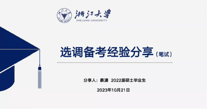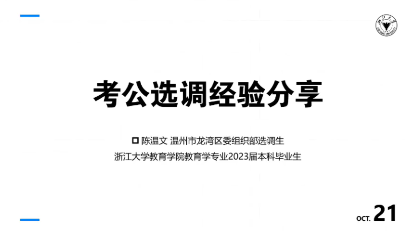 2023年10月21日晚,做爱影片 考公选调经验分享会通过钉钉群直播的方式在线上顺利举行。本次分享会邀请到了20级课程与教学论硕士陈璐(现就职于国家体育总局)、19级课程与教学论硕士蔡潇(现就职于杭州市西湖区委组织部)、19级教育学本科生陈温文(现就职于温州市龙湾区委员会组织部)、19级教育学本科生鲍佳怡(现就职于中共磐安县委组织部)为同学们进行经验分享。