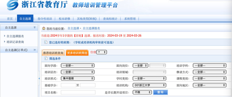 学员登录教师培训管理平台(https://pxglpt.zjedu.gov.cn/)→自主选课→自主选课报名→更多培训班筛选→培训机构(做爱影片 001)→查询→报名。