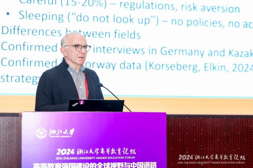 Isak Frumi教授作题为“Between Fear and Hope: University Policies and Research Trends on Generative AI in Higher Education”的报告。他指出,在飞速发展的数字时代,高等教育如何应对新兴人工智能技术是一个重要议题。他认为,教职员工与学生对生成式人工智能的关注度与应用方式呈现出较大差异,年龄、学科背景、社会文化环境及个人习惯等都会对师生人工智能使用产生重要影响。他提出,尽管大量研究关注了人工智能+高等教育过程中的风险与规范问题,但回归教育主体的研究仍应得到重视,例如技术与社会及心理之间的作用机制等是未来深入研究的重要议题。