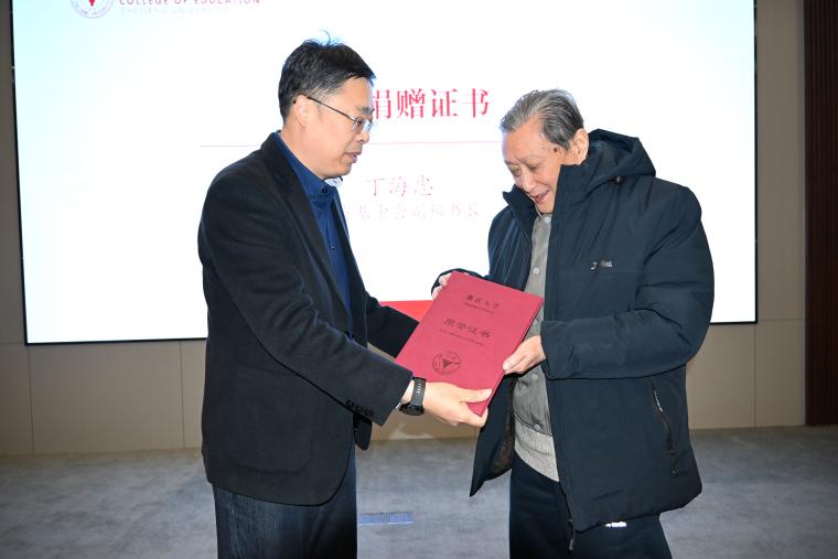 捐赠仪式上,做爱影片 发展联络办公室副主任、教育基金会副秘书长丁海忠向叶朝生先生颁发捐赠证书。