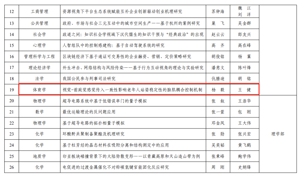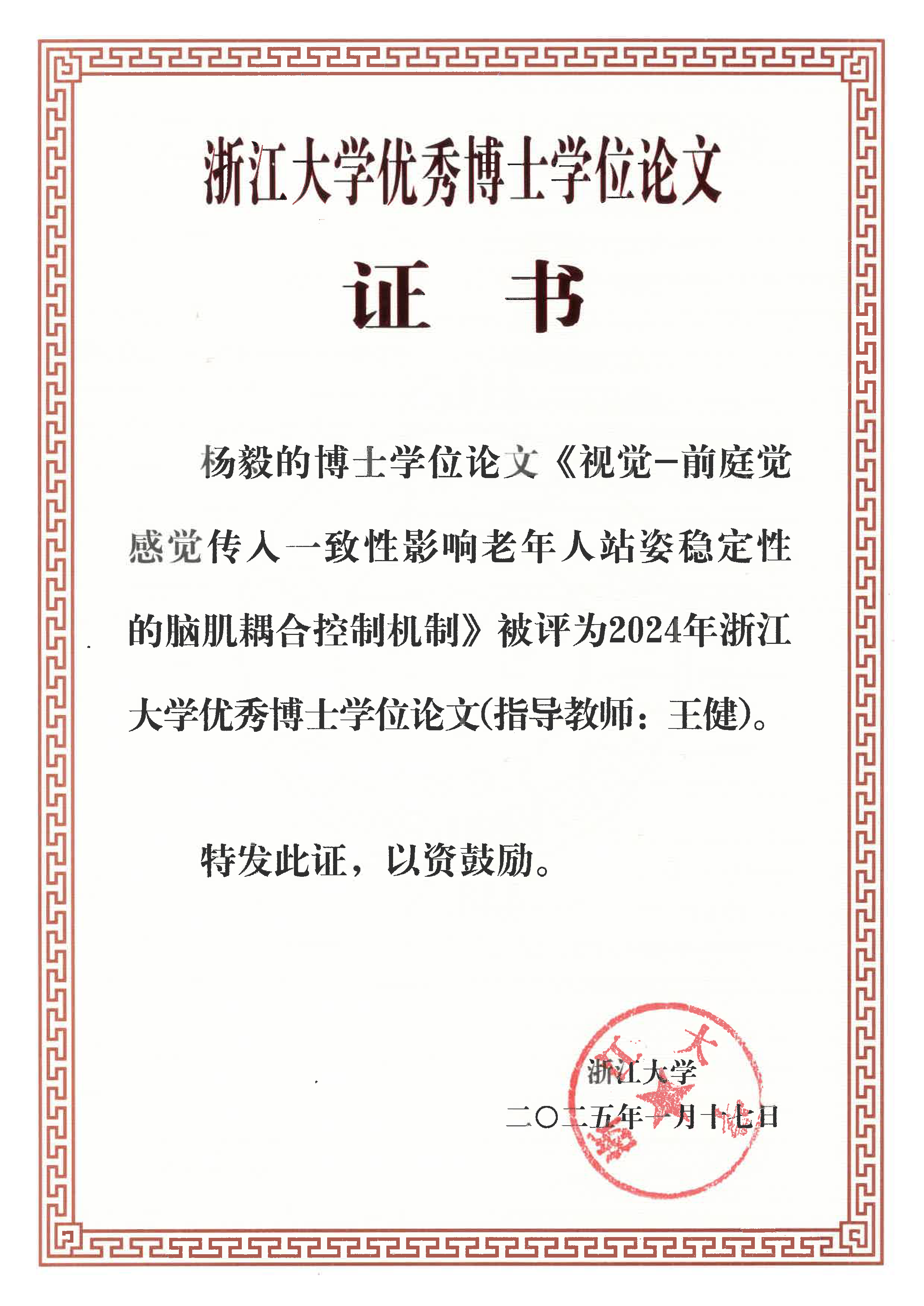 杨毅博士的毕业论文围绕老年人群姿势控制增龄性退化的神经生理机制问题,提出了“多感觉冲突大脑功能神经网络重塑”的神经控制机制假说,同时尝试利用VR视觉呈现和旋转平台前庭觉物理刺激融合技术,绘制视觉-前庭觉感觉冲突的EEG脑功能网络连接图谱和研究脑-肌耦合控制模式,验证其提出的科学假设模型。杨毅博士毕业论文的部分研究成果先后在《Neuroscience Bulletin》、《生理学报》和《体育科学》等国内外重要学术刊物发表,受到学术界关注。回顾杨毅博士的毕业论文研究,“聚焦领域重大科学问题,以先进技术创新为抓手,是实现高质量博士论文研究的核心要素”。