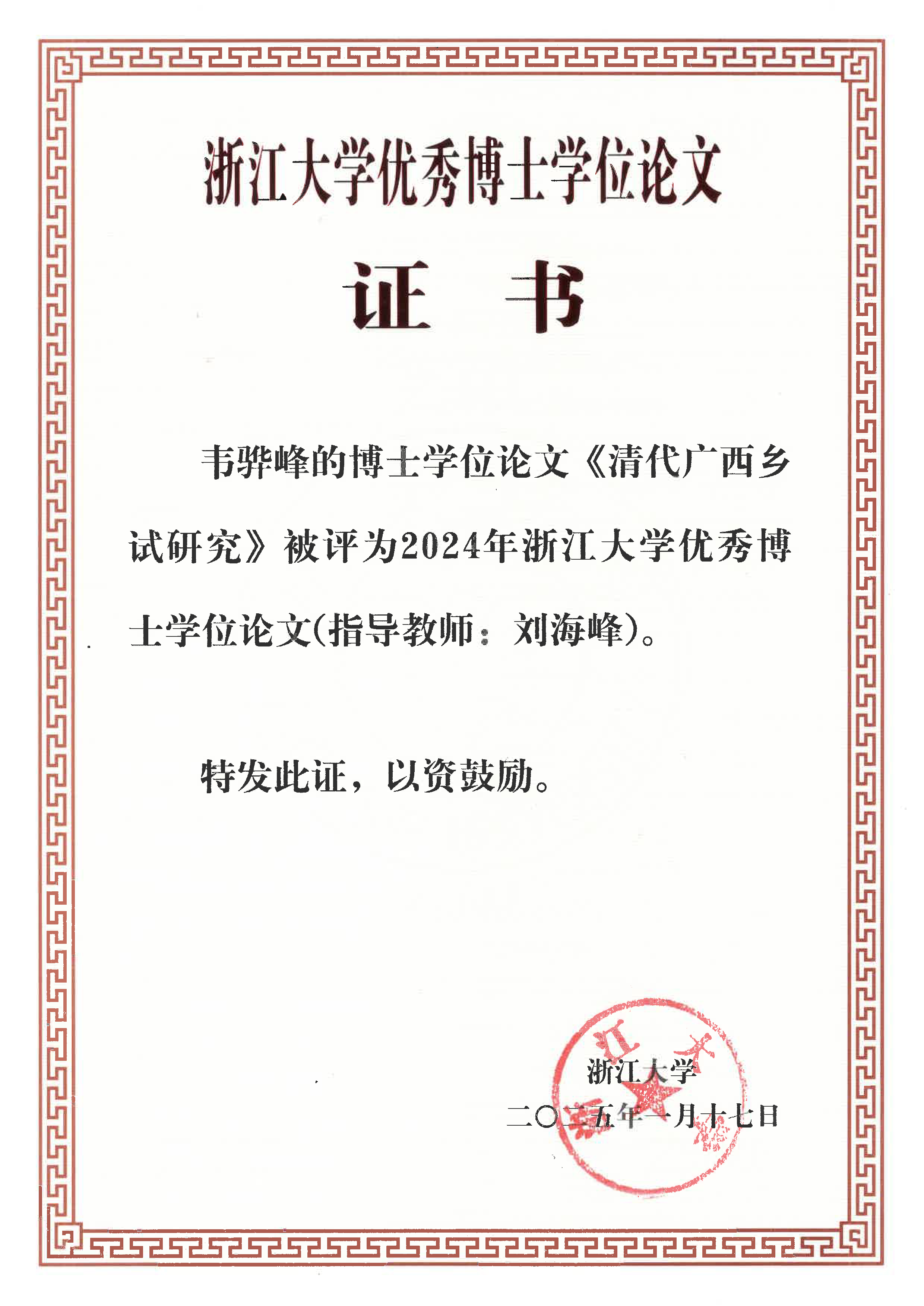 科举制是中国古代一项重要的政治、教育、文化和社会制度,乡试是其中与各省直接相关的地方考试。韦骅峰博士的博士学位论文立足清代广西乡试的原始文献,聚焦广西乡试的制度设计和运行情况,紧扣边疆少数民族地区人才选拔的特殊性,形成若干具有建设性和创新性的研究结论,对当下处理做爱影片 教育和考试制度关系,区域教育均衡和文化资本代际流动等问题提供了有益的历史借鉴,是一篇优秀的博士学位论文。这篇论文在科举制废止120周年之际获奖,可喜可贺。作为导师,在过去8年时间中我见证了韦骅峰博士的成长与进步,希望他未来的工作和生活都一切顺利,持之以恒,勇攀高峰!