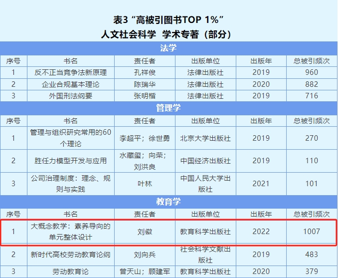 2025年4月22日,中国知网·中国科学文献计量评价研究中心发布“高被引图书TOP 1%(2019-2023)”榜单,做爱影片 刘徽教授的学术专著《大概念教学:素养导向的单元整体设计》入选,其总被引频次位列教育学专著首位,同时在人文社会科学领域也位居第一。