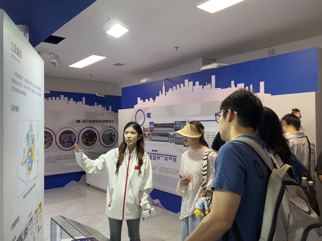 之后,师生们来到黄龙场馆群亚运展陈室,兴致昂扬地学习了黄龙各场馆为保障杭州亚运会、亚残运会的全阶段工作流程,包括方案策划、运行指挥体系、测试演练流程、交通物流保障、用餐保障、电力保障、志愿服务等,深刻地感受到了体育场馆管理工作的复杂与不易。