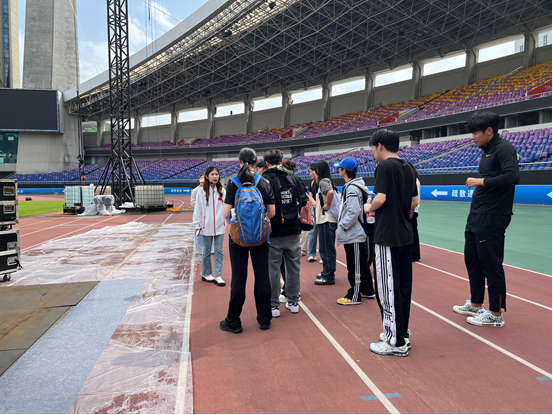 师生一行首先在西大厅观看了黄龙体育中心的视频介绍,参观了杭州亚运会、亚残运会期间竞赛运行的陈列物件,以及社会各界对黄龙体育中心高度评价的新闻报道、感谢信等。接着,在讲解员的带领下,师生深入地了解黄龙体育中心的历史发展、场馆构成、改造历程和改造亮点。随后,师生进入黄龙体育场内,近距离地感受了跑道、草坪、双环投影等设施的功能与魅力。