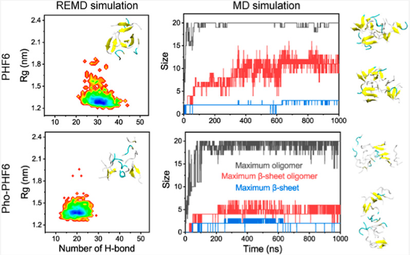 Abnormal aggregation of the microtubule-associated protein tau into intracellular fibrillary inclusions is characterized as the hallmark of tauopathies, including Alzheimer’s disease and chronic traumatic encephalopathy. The hexapeptide 306VQIVYK311 (PHF6) of R3 plays an important role in the aggregation of tau. Recent experimental studies reported that phosphorylation of residue tyrosine 310 (Y310) could decrease the propensity of PHF6 to form fibrils and inhibit tau aggregation. However, the underlying inhibitory mechanism is not well understood. In this work, we systematically investigated the influences of phosphorylation on the conformational ensembles and oligomerization dynamics of PHF6 by performing extensive all-atom molecular dynamics (MD) simulations. Our replica exchange MD simulations demonstrate that Y310 phosphorylation could effectively suppress the formation of β-structure and shift PHF6 oligomers toward coil-rich aggregates. The interaction analyses show that hydrogen bonding and hydrophobic interactions among PHF6 peptides, as well as Y310−Y310 π−π stacking and I308−Y310 CH−π interactions, are weakened by phosphorylation. Additional microsecond MD simulations show that Y310 phosphorylation could inhibit the oligomerization of PHF6 by preventing the formation of large β-sheet oligomers and multi-layer β-sheet aggregates. This study provides mechanistic insights into the phosphorylation-inhibited tau aggregation, which may be helpful for the in-depth understanding of the pathogenesis of tauopathies.