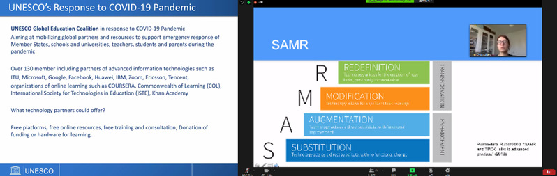 联合国教科文组织信息技术研究所主任展涛教授介绍了其单位在疫情期间,针对如何将“技术”融入“教育”所开展的措施,包括定期召开能力建设网络研讨会,提供免费的网络教学资源和工具以及搭建学习合作平台等。教育数字实验室的Irina Dvoretskaya研究员认为“技术强化学习”是一种在课程设计中适当运用科技,并且有助于发展创新能力的教学方法,最终将提升和丰富学习者的学习经验。HSE教育研究所的Andrey Zakharov研究员以计算机辅助学习对师生的影响为主题,研究了计算机辅助学习对不同学科和学习水平学生的影响,以及对教师教学负担影响。