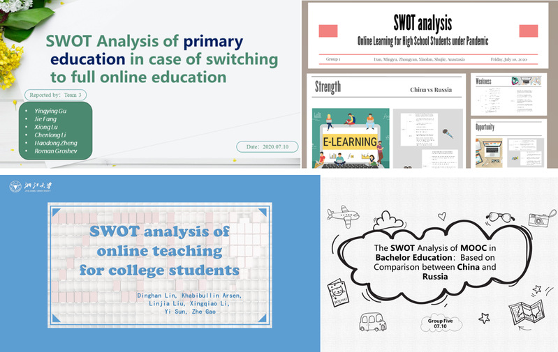 开课初期,俄方老师便布置了项目任务——由团队同学自由组成小组,中方同学可邀请俄方同学加入。各小组在组建完成后,由组长引导小组自主选择小学/初中/高中/大学/其他等其中一个教育阶段,并采用SWOT分析的研究方法开展以“完全在线形式教学”为主题的相关研究。