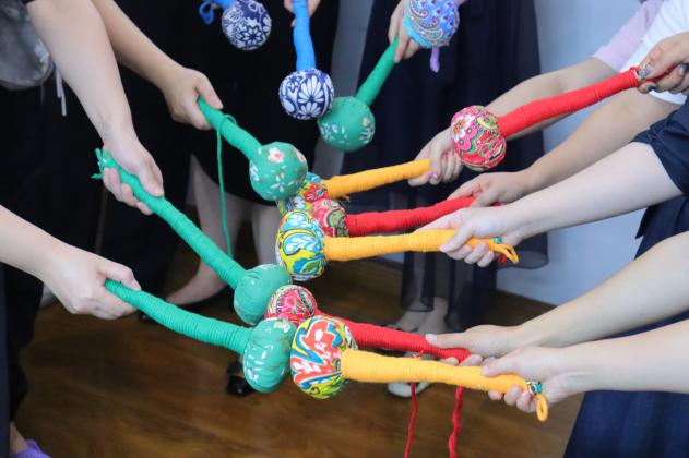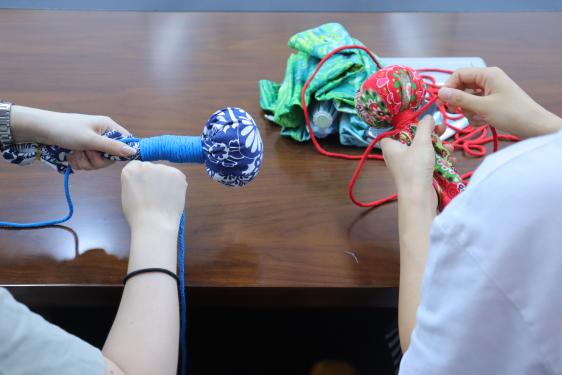 在培训师的详细介绍下,老师们纷纷动手,将一片片普通布料和一块块棉絮棉絮,经过耐心制作,变成了一把把既实用又充满爱意的养生锤。